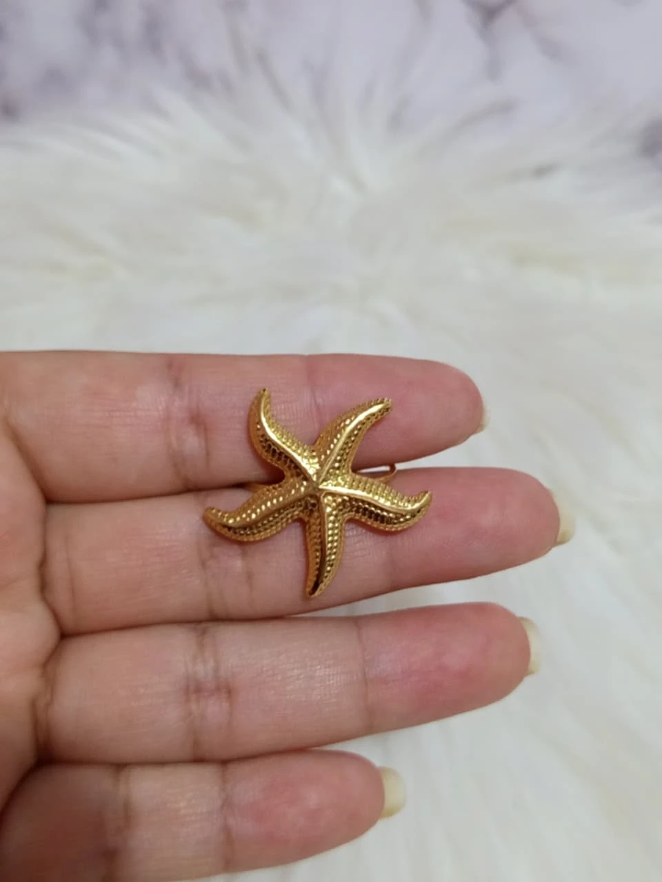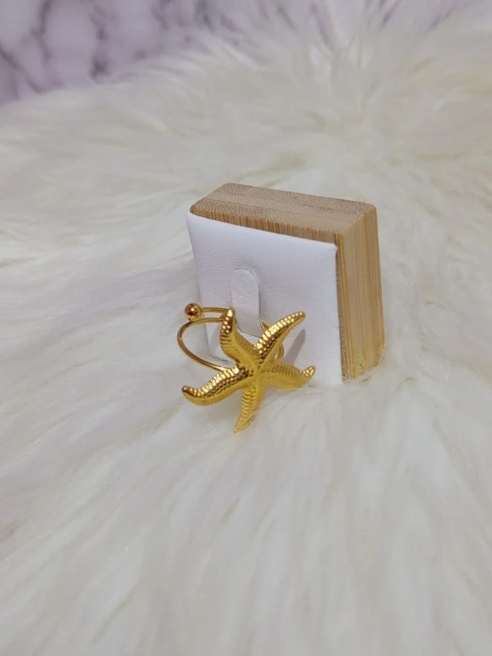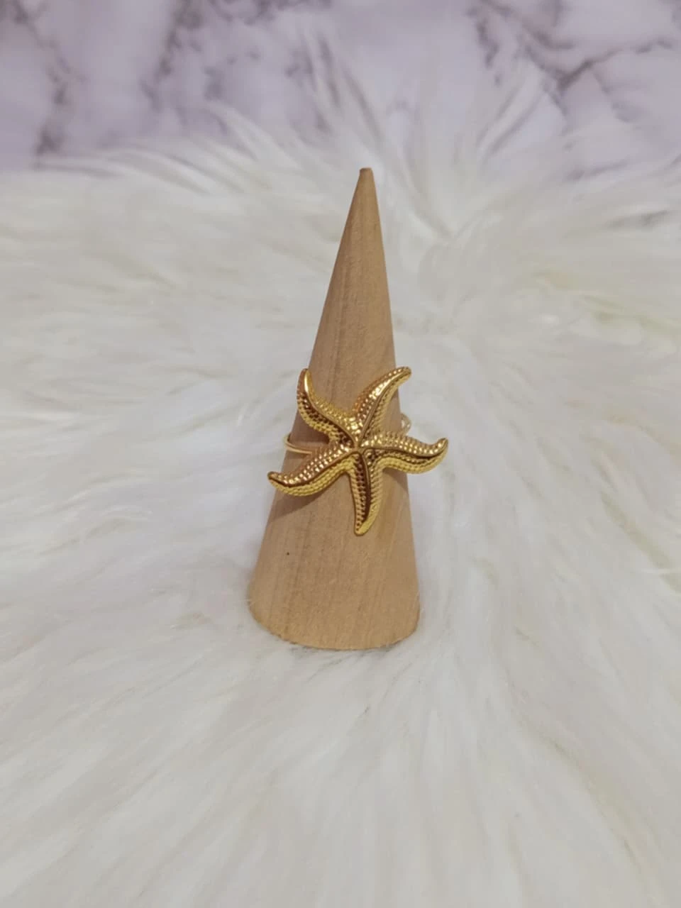 Anillo de acero inoxidable en color dorado, con forma de estrella de mar . Ajustable
