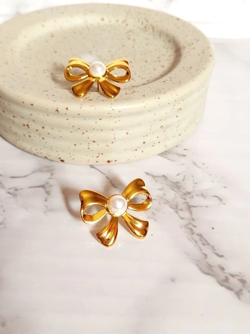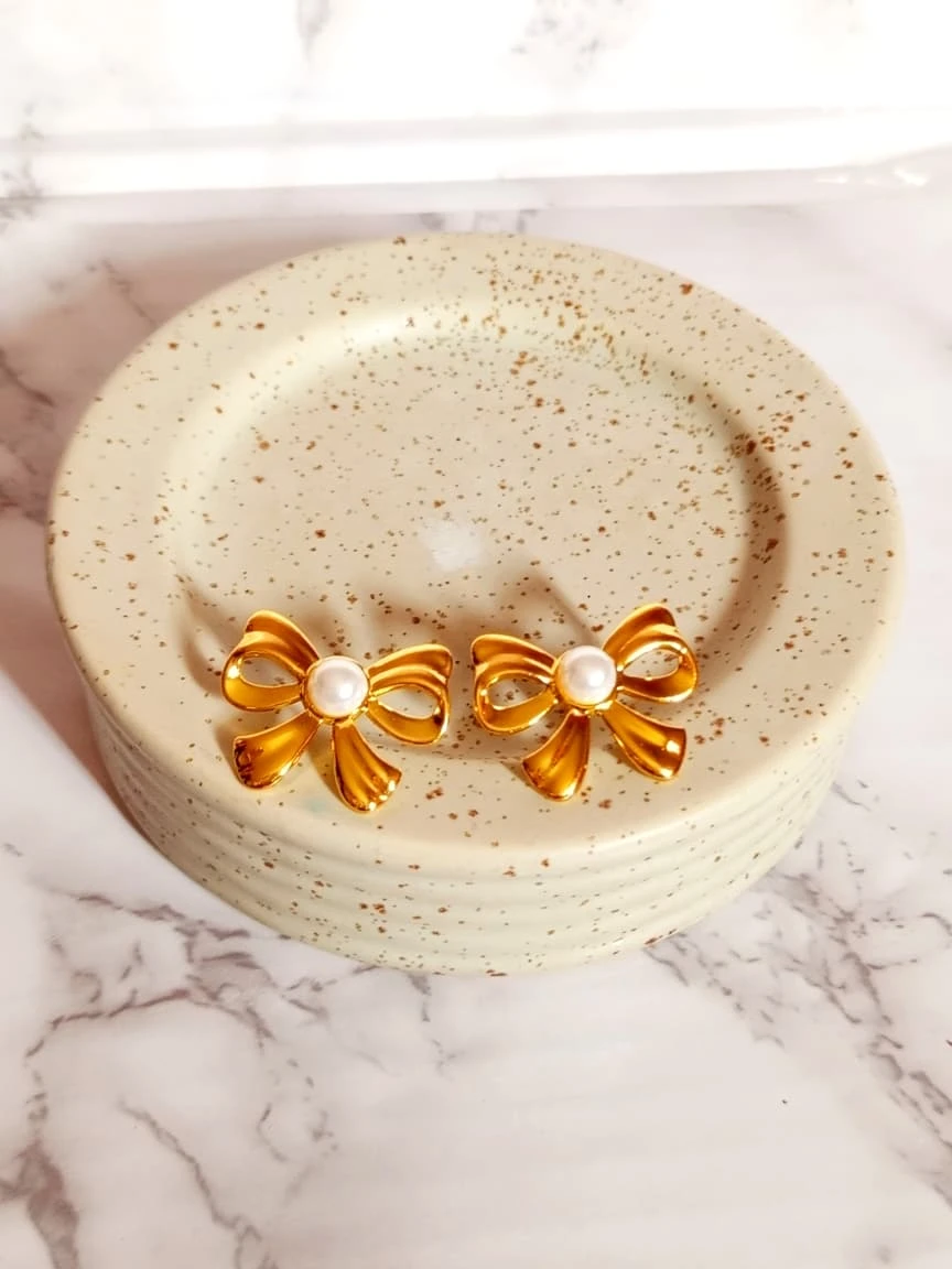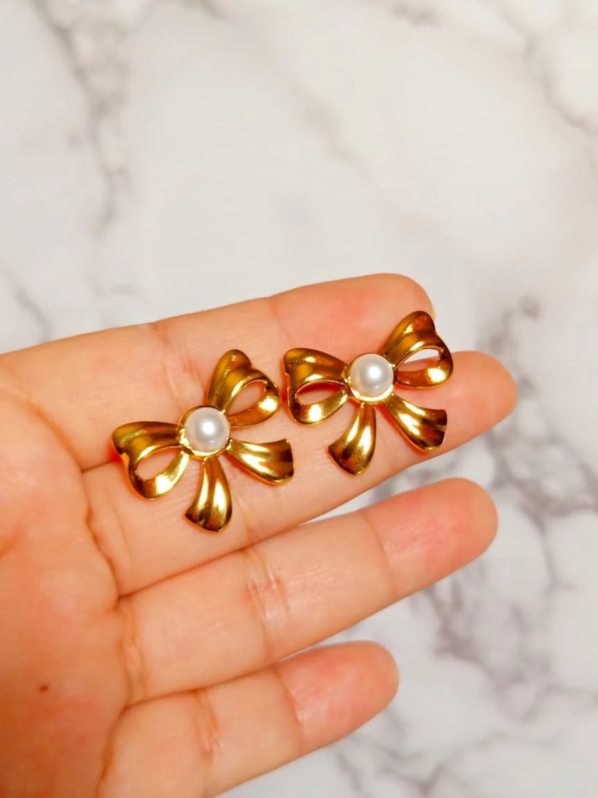 Aretes de acero inoxidable con diseño de lazo con perla en el centro.