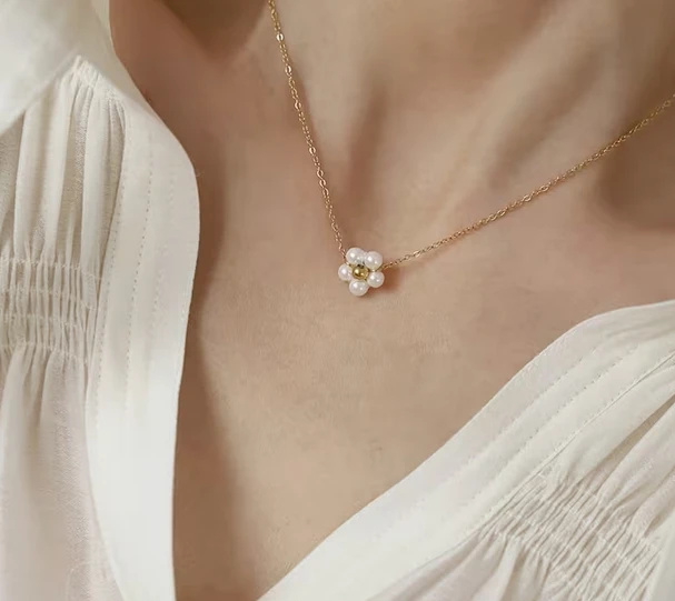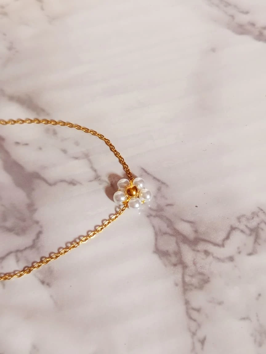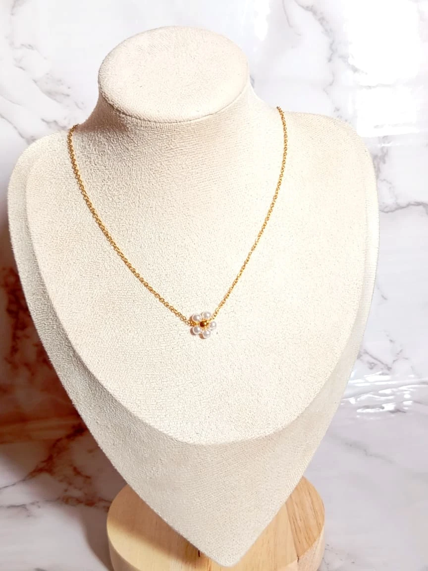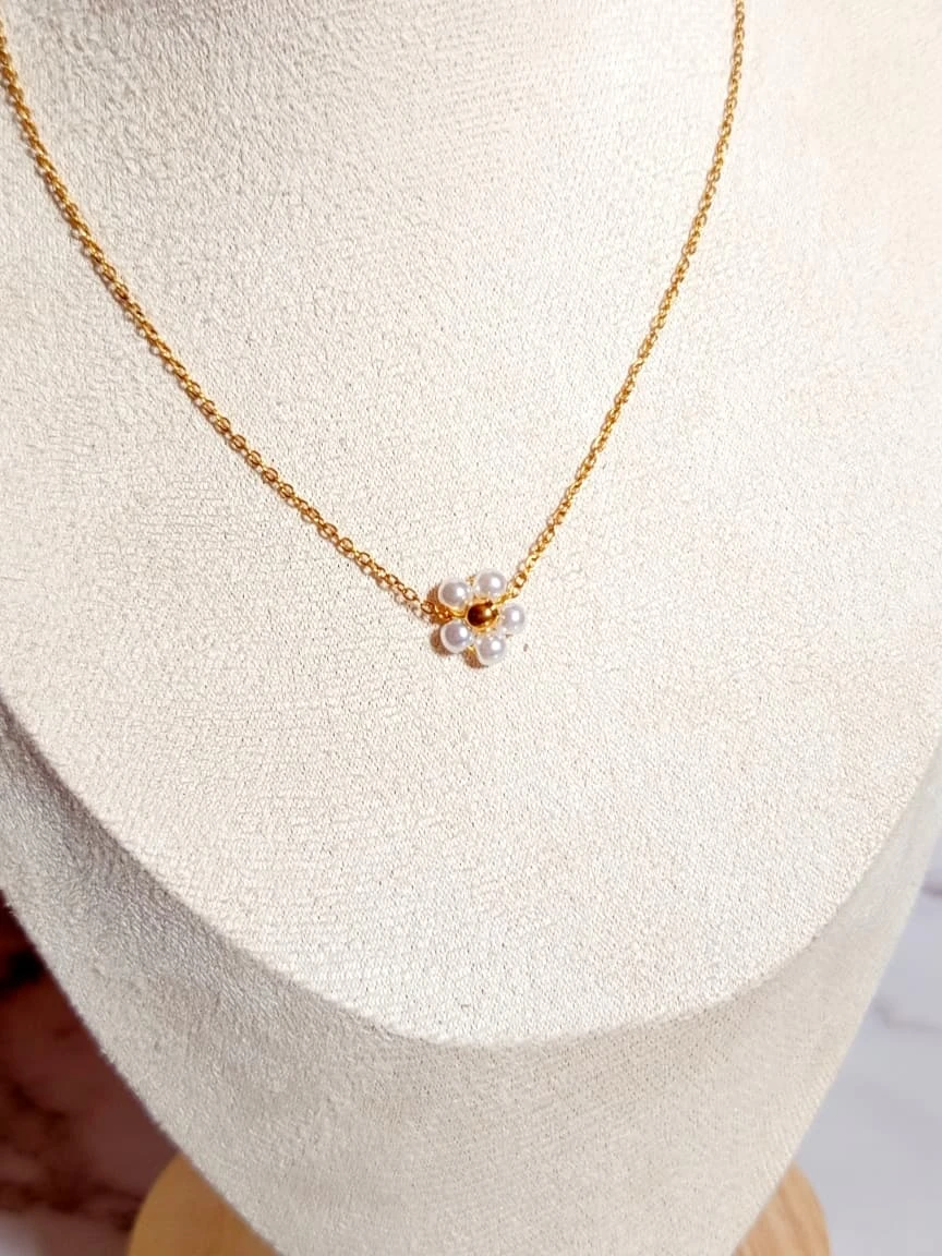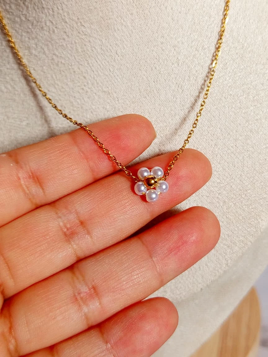 Collar de acero inoxidable con flor de perlitas , en tamaño mini