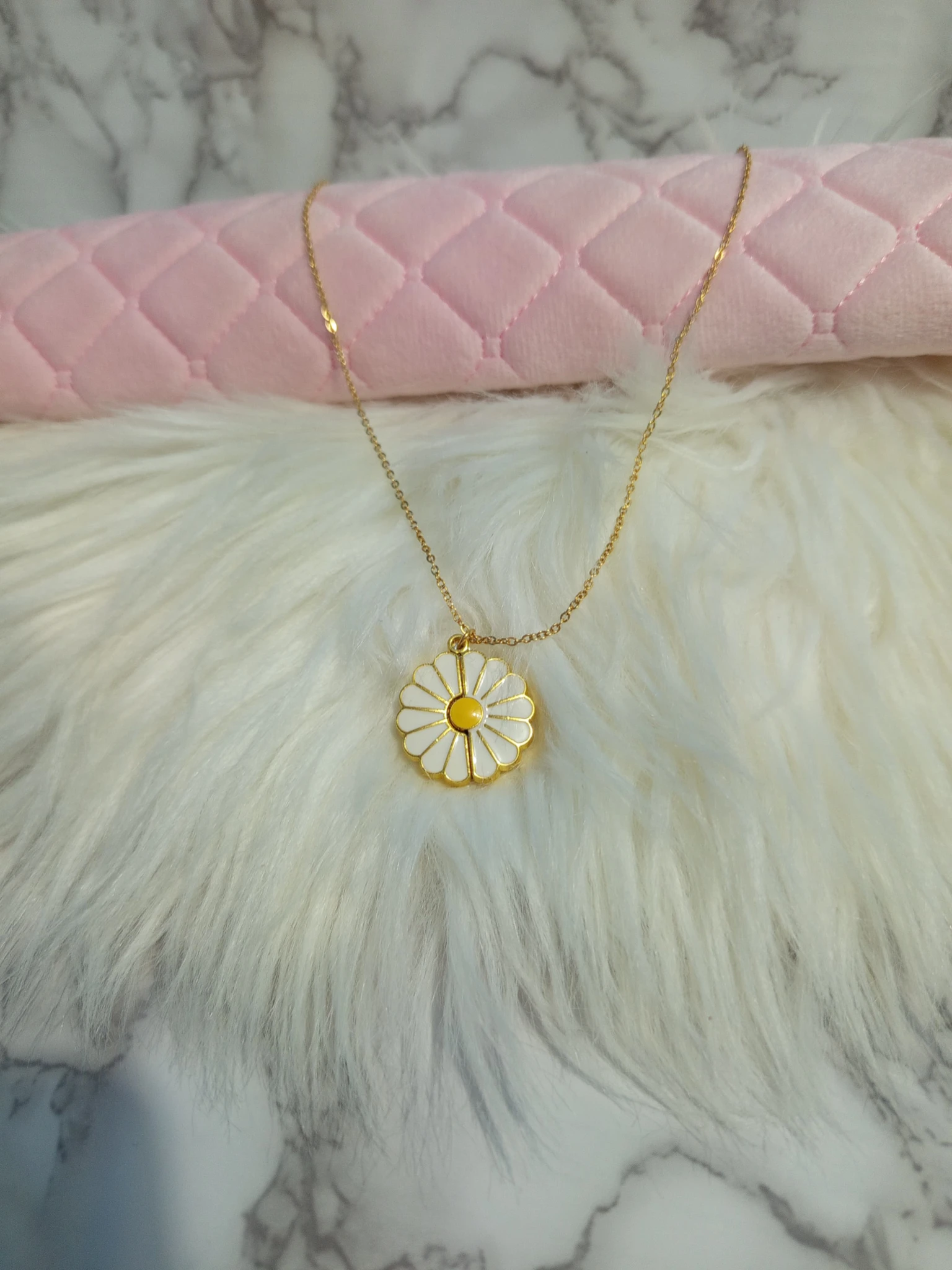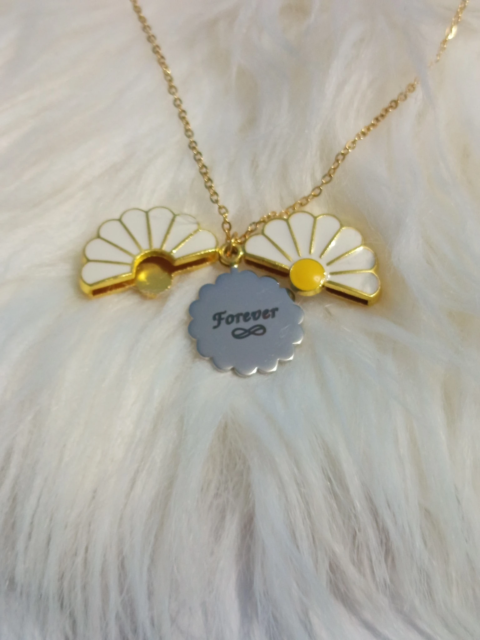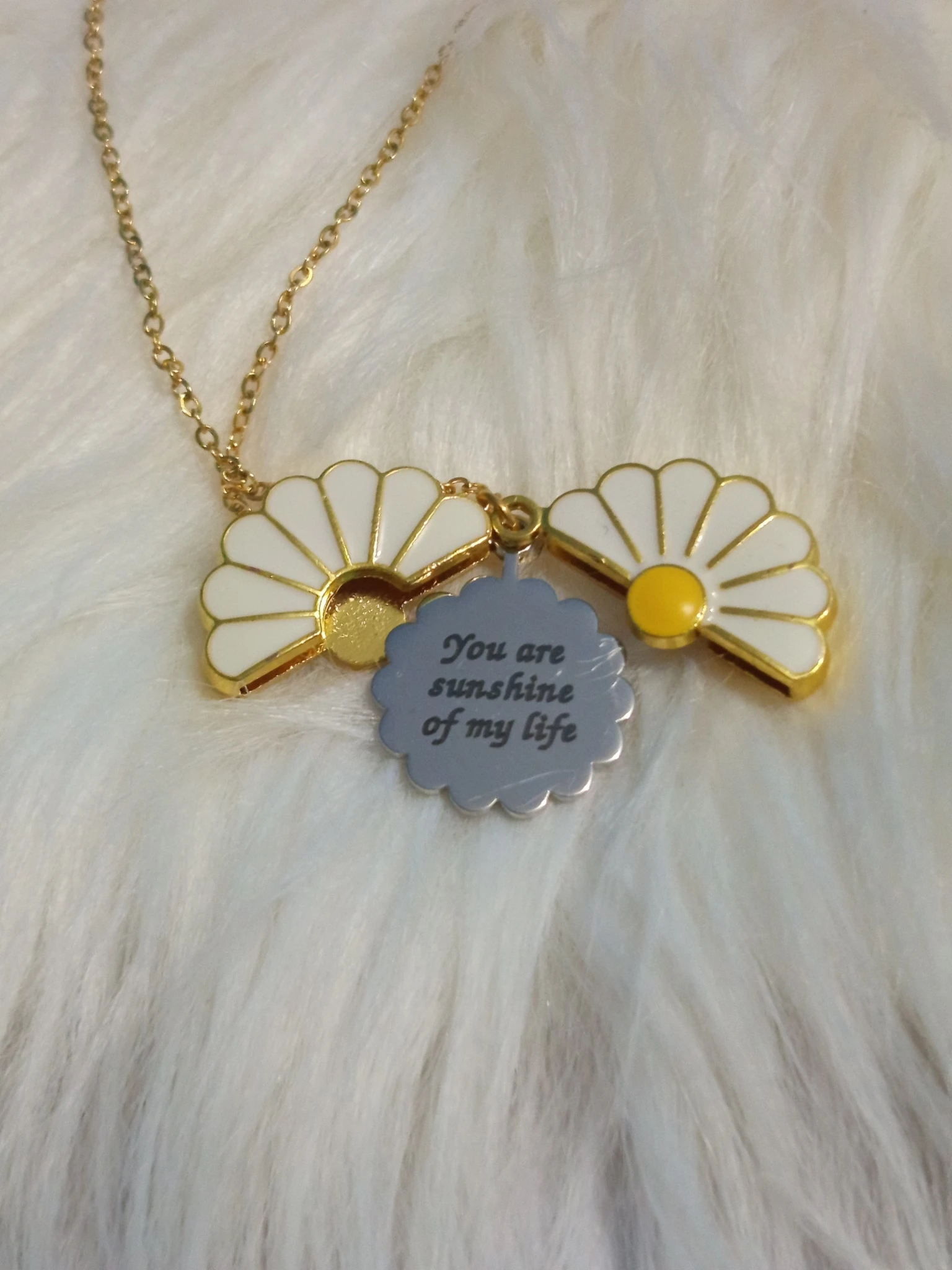 Collar en forma de flor margarita que se abre con frase doble. Material: aleacion.
